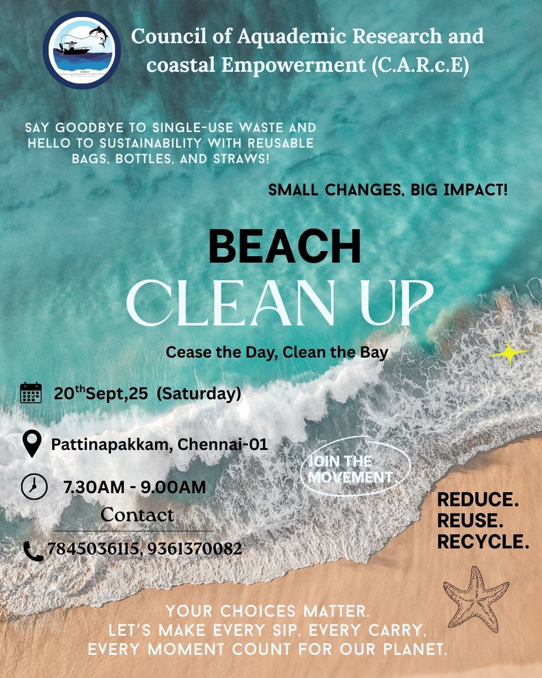 Beach Clean-Up Drive at Pattinambakkam – 20th September 2025 On the occasion of International Coastal Cleanup Day, CARCE organised a Beach Clean-Up Drive on 20th September 2025 at Pattinambakkam Beach. The initiative aimed to raise awareness about marine conservation and the importance of keeping our coastlines clean and sustainable. Volunteers from CARcE, along with local...