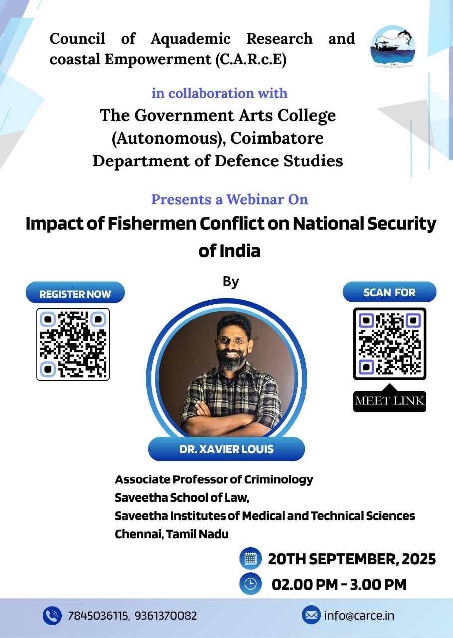 Impact of Fishermen Conflict on National Security of India– 20th September 2025 CARcE successfully organised a webinar series on “Impact of Fishermen Conflict on National Security of India” on 20th September 2025. The session featured an eminent speaker, who shared valuable insights into the complex dynamics of maritime boundaries, cross-border challenges, and their implications for...