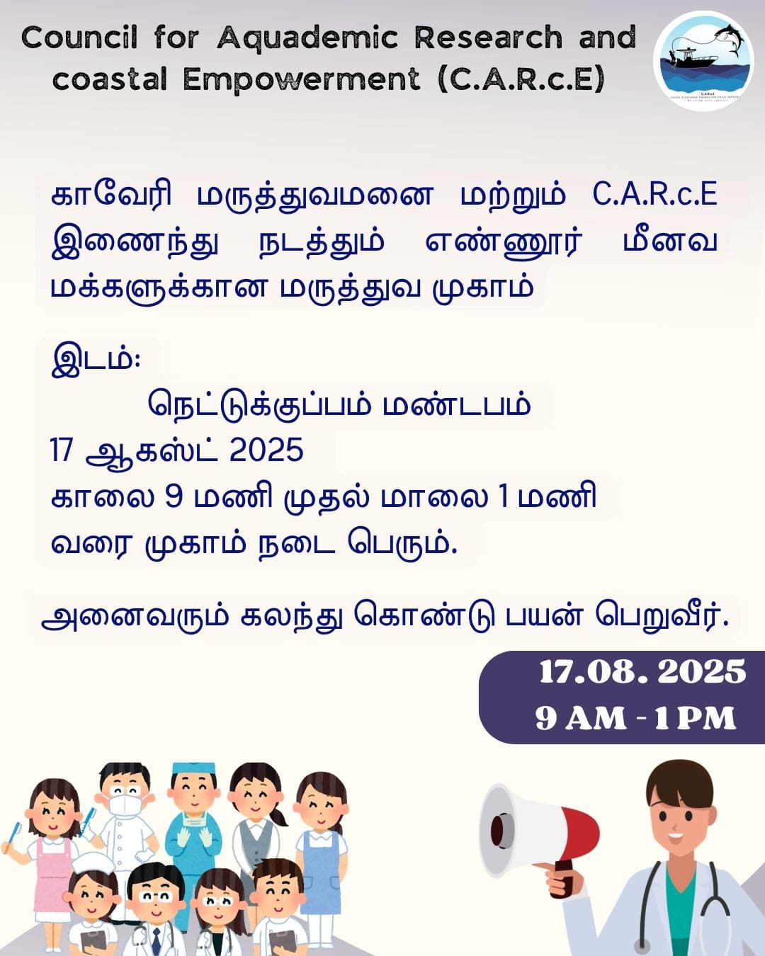 Medical Camp at Nettukuppam, Ennore – 17th August CARcE organised a comprehensive medical camp on 17th August at Nettukuppam, Ennore, aimed at promoting community health and well-being. The camp offered general health check-ups, along with specialised consultations in dermatology and ophthalmology (eye care). Our dedicated medical team provided essential health services, early diagnosis, and guidance...